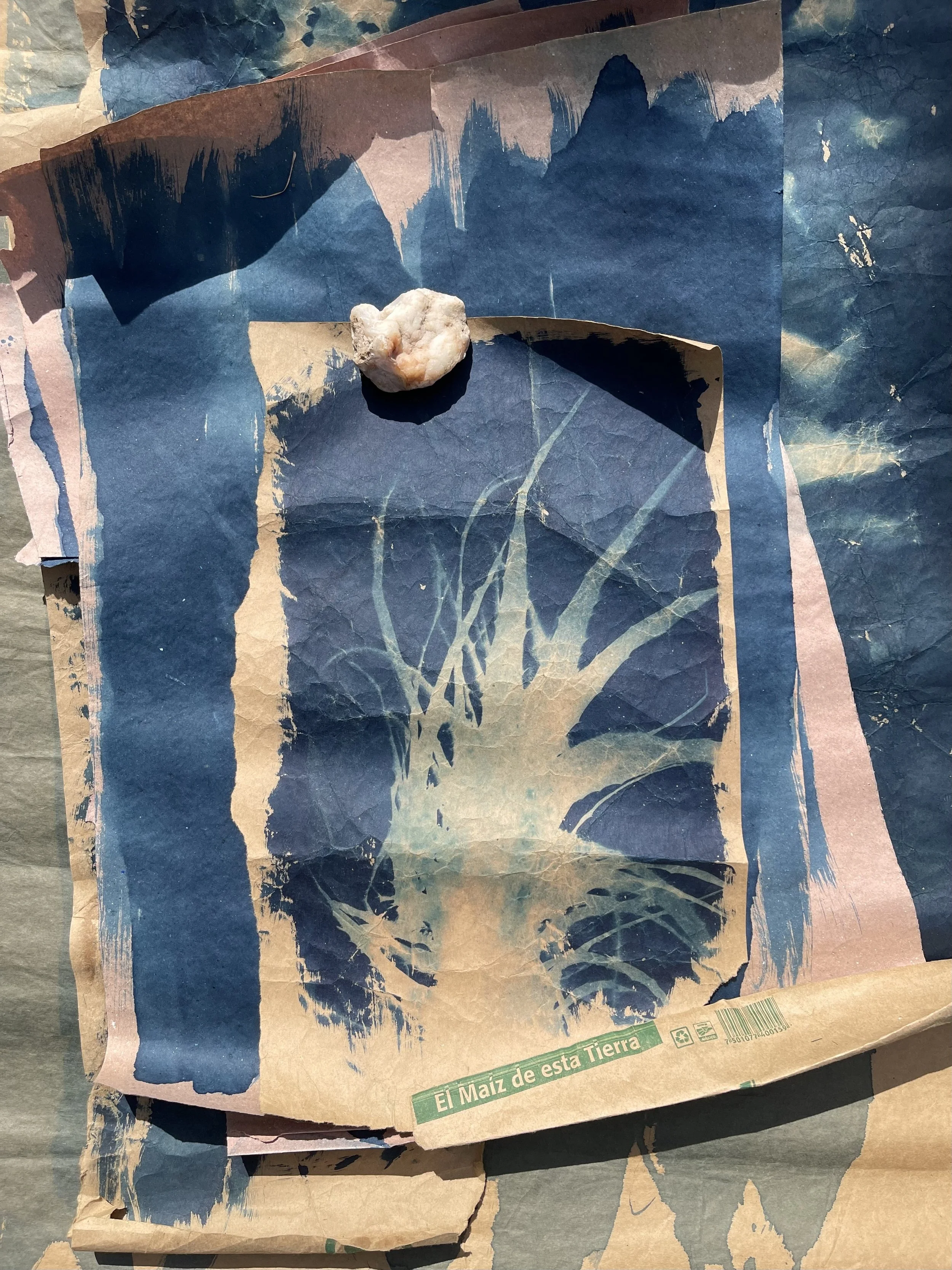 Everyday I would take to the garden with my large, light-sensitive containers filled with recycled paper bags from corn sacks collected at the Central de Abastos Mercado that I treated with cyanotype chemistry. Plant species that had been pruned for compost would be placed on the treated paper bags and left in the strength of the Oaxacan sun to impress their essence on the recycled corn sacks.